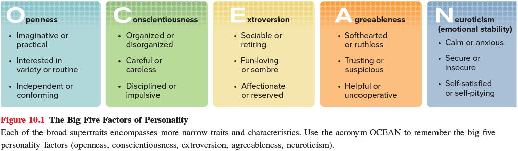 Big five factors of personality: openness to experience, conscientiousness, extroversion, agreeableness, neuroticism (emotional stability).(1998; McCrae & Costa, 2006)