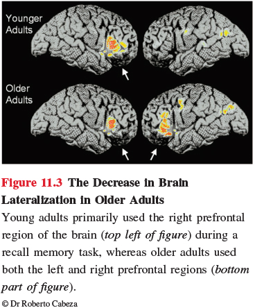 Lateralization begins to decrease with age where the specialization of function in one hemisphere of the brain is reduced