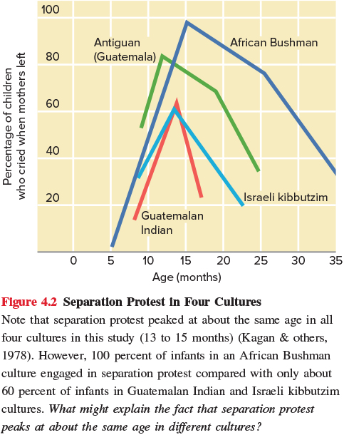 Kagan (1976) reports small differences in age of maximum separation anxiety across cultures
